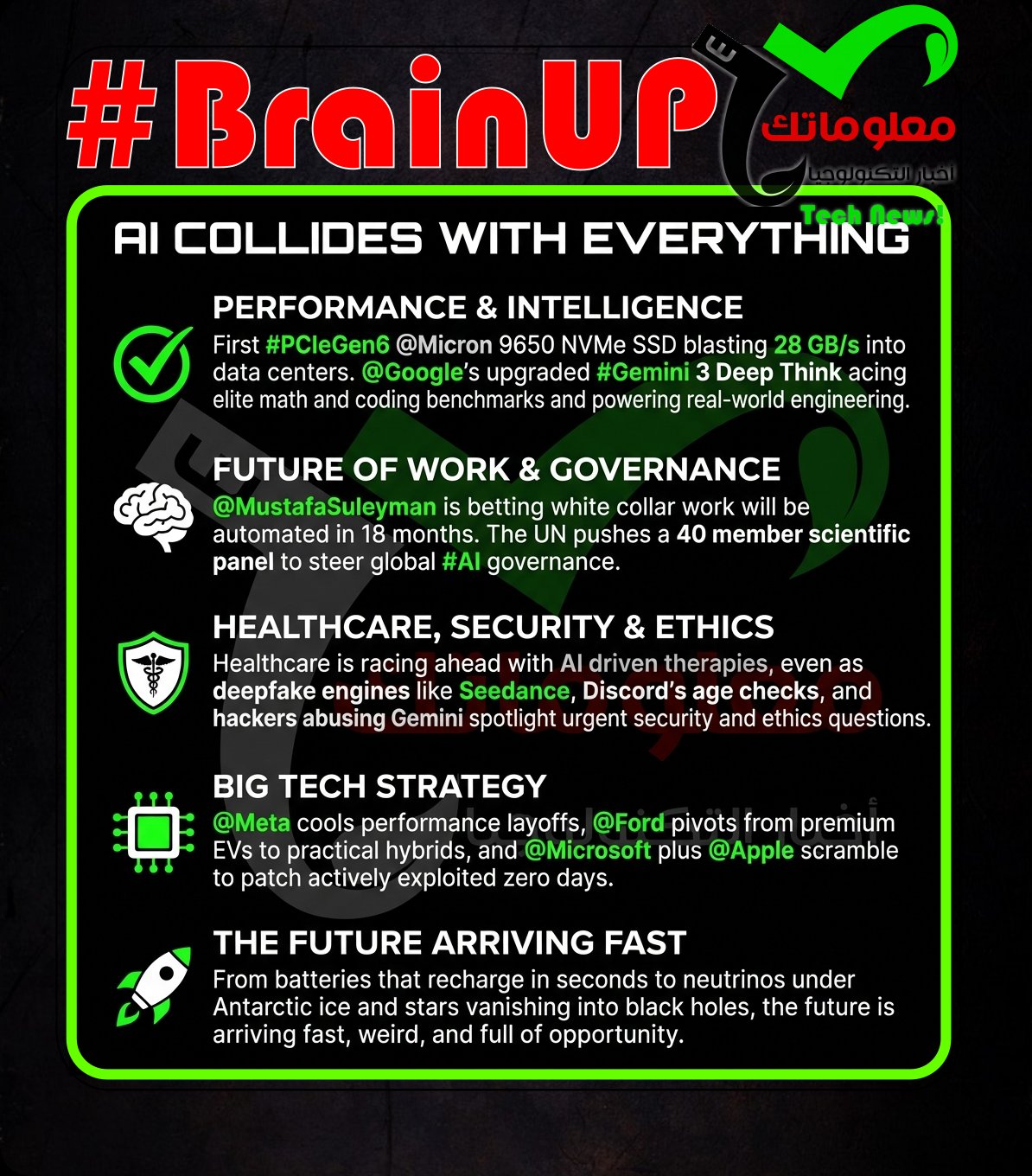 AI is colliding with everything: from the first #PCIeGen6 @Micron 9650 NVMe SSD blasting 28 GB/s into data centers, to @Google’s upgraded #Gemini 3 Deep Think acing elite math and coding benchmarks and powering real-world engineering. In boardrooms, @MustafaSuleyman is betting white collar work will be automated in 18 months, while the UN pushes a 40 member scientific panel to steer global #AI governance. Healthcare is racing ahead with AI driven therapies, even as deepfake engines like Seedance, Discord’s age checks, and hackers abusing Gemini spotlight urgent security and ethics questions. Big Tech is reshaping strategy: @Meta cools performance layoffs, @Ford pivots from premium EVs to practical hybrids, and @Microsoft plus @Apple scramble to patch actively exploited zero days. From batteries that recharge in seconds to neutrinos under Antarctic ice and stars vanishing into black holes, the future is arriving fast, weird, and full of opportunity. …