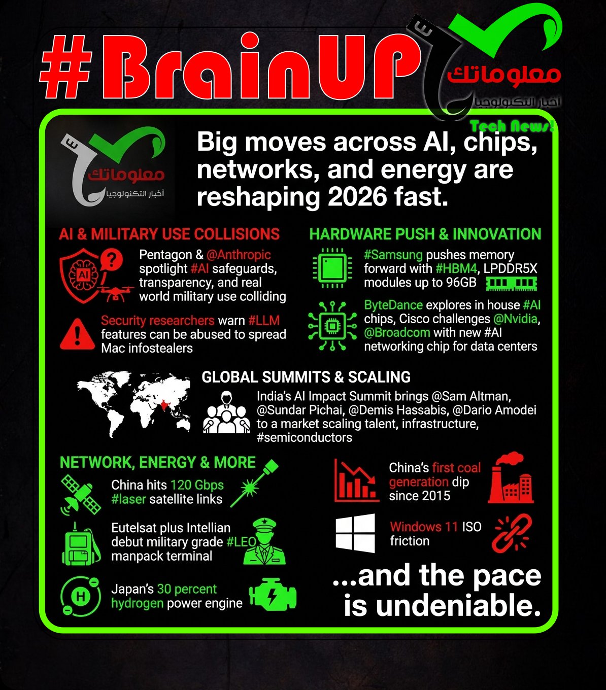 Big moves across AI, chips, networks, and energy are reshaping 2026 fast. The Pentagon and @Anthropic spotlight how #AI safeguards, transparency, and real world military use are colliding, while security researchers warn that #LLM features can be abused to spread Mac infostealers. On the hardware front, #Samsung pushes memory forward with #HBM4 and LPDDR5X modules up to 96GB, as ByteDance explores in house #AI chips and Cisco challenges @Nvidia and @Broadcom with a new #AI networking chip for data centers. India’s AI Impact Summit brings @Sam Altman, @Sundar Pichai, @Demis Hassabis, and @Dario Amodei to a market that is scaling talent, infrastructure, and #semiconductors. Meanwhile, China hits 120 Gbps #laser satellite links, and Eutelsat plus Intellian debut a military grade #LEO manpack terminal. Add Japan’s 30 percent hydrogen power engine, China’s first coal generation dip since 2015, and even Windows 11 ISO friction, and the pace is undeniable. …