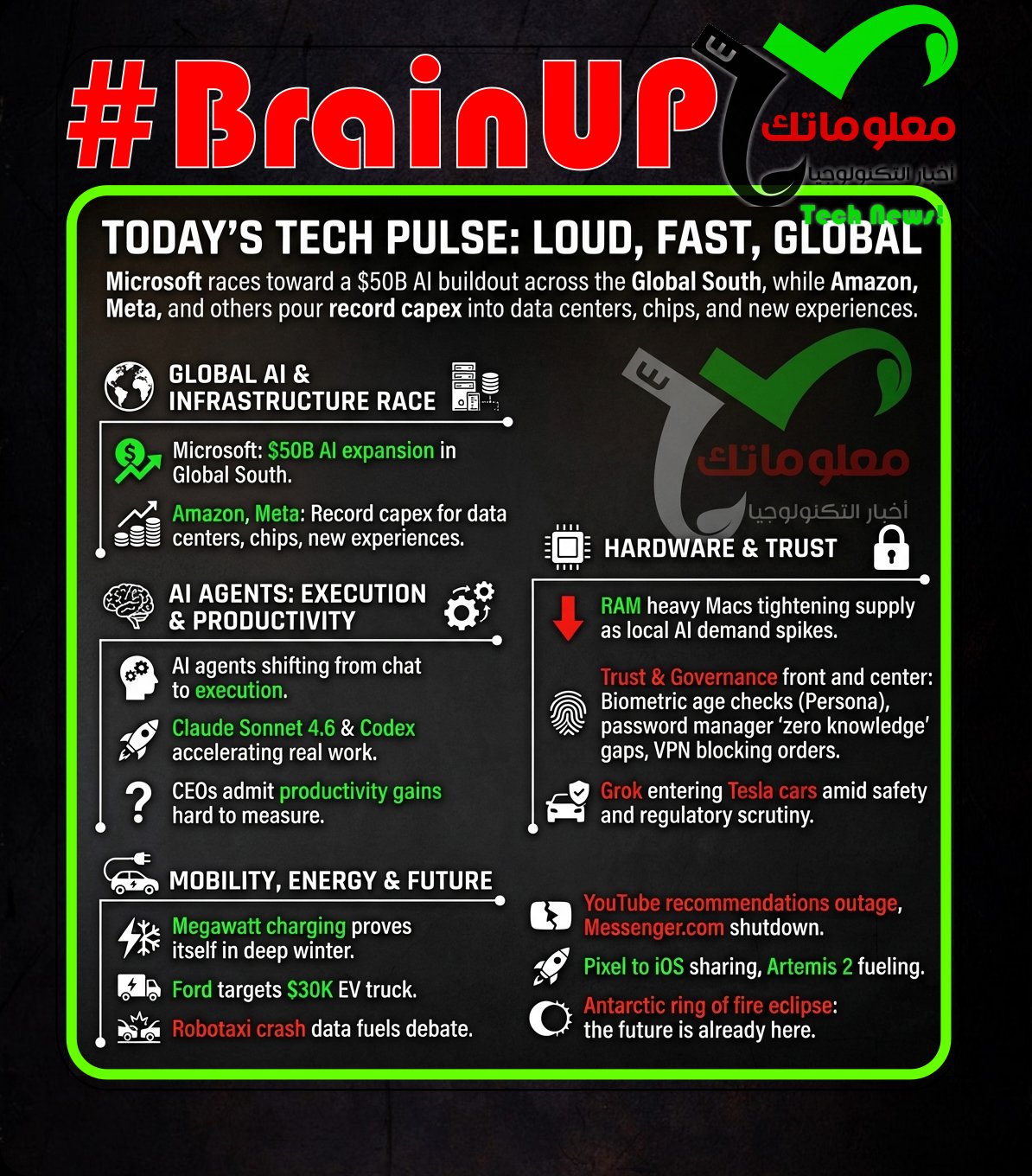 Today’s tech pulse is loud, fast, and global: Microsoft is racing toward a $50B AI buildout across the Global South, while Amazon, Meta, and others pour record capex into data centers, chips, and new experiences. AI agents are shifting from chat to execution, with Claude Sonnet 4.6 and tools like Codex accelerating real work, even as CEOs admit productivity gains are still hard to measure. Hardware is feeling the heat too, with RAM heavy Macs tightening supply as local AI demand spikes. Meanwhile, trust and governance are front and center: biometric age checks tied to Persona, password manager “zero knowledge” gaps, VPN blocking orders, and Grok entering Tesla cars amid safety and regulatory scrutiny. On the mobility front, megawatt charging proves itself in deep winter, Ford targets a $30K EV truck, and robotaxi crash data fuels debate. Add a YouTube recommendations outage, Messenger.com shutdown, Pixel to iOS sharing, Artemis 2 fueling, and an Antarctic ring of fire eclipse: the future is already here. …