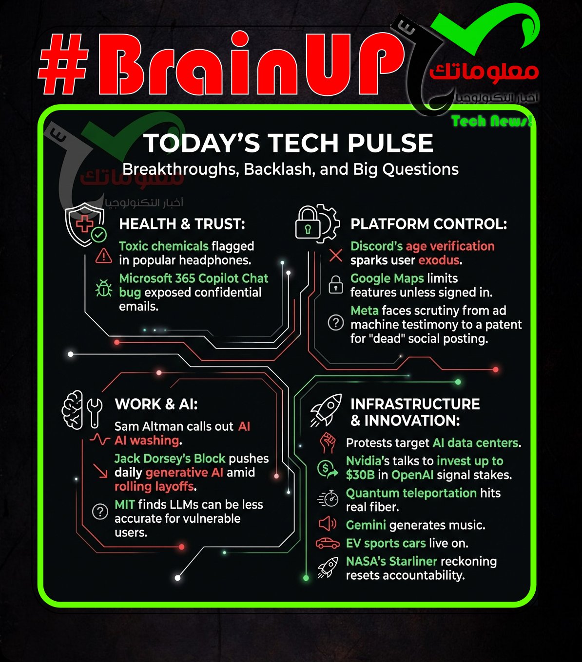 Today’s tech pulse is a mix of breakthroughs, backlash, and big questions. Health and trust are front and center, from toxic chemicals flagged in popular headphones to a #Microsoft365 #CopilotChat bug that exposed confidential emails. Platforms are tightening control, #Discord’s age verification sparks a user exodus, and #GoogleMaps quietly limits features unless you sign in, while @Meta faces scrutiny from ad machine testimony to a patent for “dead” social posting. Work is being reshaped in real time, @Sam Altman calls out #AI washing, @Jack Dorsey’s Block pushes daily #generativeAI amid rolling layoffs, and MIT finds #LLMs can be less accurate for vulnerable users. The infrastructure story is huge, protests target #AI data centers, and @Nvidia’s reported talks to invest up to $30B in @OpenAI signal the stakes. Meanwhile, quantum teleportation hits real fiber, #Gemini generates music, EV sports cars live on, and #NASA’s Starliner reckoning resets accountability. …