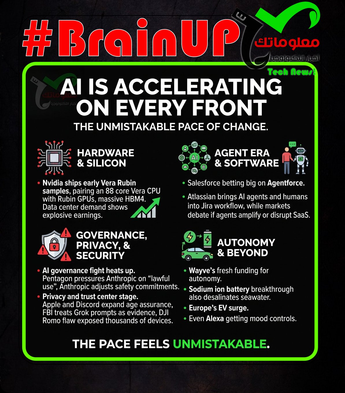 AI is accelerating on every front, from silicon to software to policy. Nvidia just shipped early Vera Rubin samples, pairing an 88 core Vera CPU with Rubin GPUs and massive HBM4, while earnings show data center demand is still exploding. The agent era is getting real: Salesforce is betting big on Agentforce, and Atlassian is bringing AI agents and humans into the same Jira workflow, while markets debate whether agents amplify or disrupt SaaS. Meanwhile, the AI governance fight is heating up as the Pentagon pressures Anthropic on “lawful use,” and Anthropic adjusts its own safety commitments. Privacy and trust are center stage too: Apple and Discord expand age assurance, the FBI treats Grok prompts as evidence, and a DJI Romo flaw exposed thousands of devices. Add in Wayve’s fresh funding for autonomy, a sodium ion battery breakthrough that also desalinates seawater, Europe’s EV surge, and even Alexa getting mood controls, and the pace feels unmistakable. …