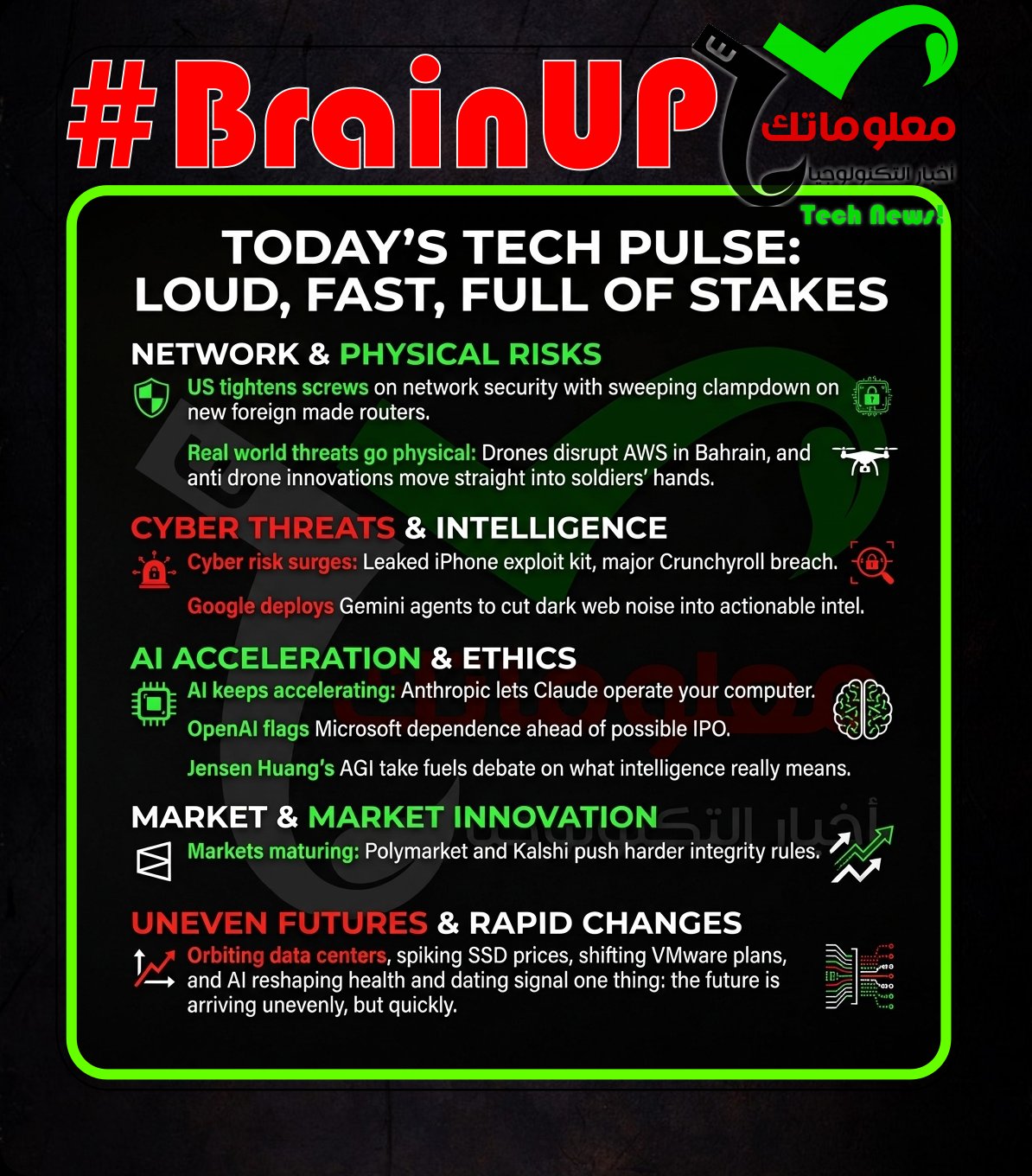 Today’s tech pulse is loud, fast, and full of stakes. The US is tightening the screws on network security with a sweeping clampdown on new foreign made routers, while real world threats go physical as drones disrupt AWS in Bahrain and anti drone innovations move straight into the hands of soldiers. Cyber risk is surging too, from a leaked iPhone exploit kit to a major Crunchyroll breach, even as Google deploys Gemini agents to cut dark web noise into actionable intel. AI keeps accelerating: Anthropic lets Claude operate your computer, OpenAI flags Microsoft dependence ahead of a possible IPO, and Jensen Huang’s AGI take fuels debate on what intelligence really means. Markets are maturing as Polymarket and Kalshi push harder integrity rules. Meanwhile, orbiting data centers, spiking SSD prices, shifting VMware plans, and AI reshaping health and dating signal one thing: the future is arriving unevenly, but quickly. …