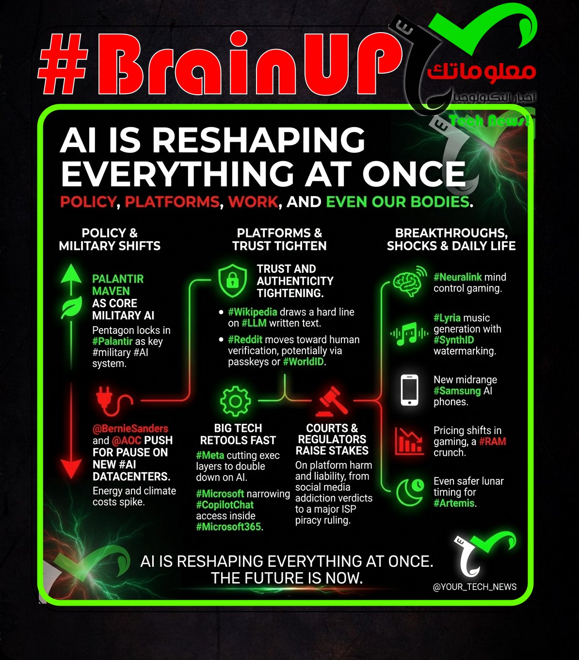 AI is reshaping everything at once, policy, platforms, work, and even our bodies. In Washington, @BernieSanders and @AOC push for a pause on new #AI datacenters as energy and climate costs spike, while the Pentagon locks in #Palantir Maven as core #military #AI. Trust and authenticity are tightening too: #Wikipedia draws a hard line on #LLM written text, and #Reddit moves toward human verification, potentially via passkeys or #WorldID. Big Tech is retooling fast, with #Meta cutting exec layers to double down on AI, and #Microsoft narrowing #CopilotChat access inside #Microsoft365. Meanwhile courts and regulators raise the stakes on platform harm and liability, from social media addiction verdicts to a major ISP piracy ruling. Add breakthroughs and shocks, #Neuralink mind control gaming, #Lyria music generation with #SynthID, new midrange #Samsung AI phones, pricing shifts in gaming, a #RAM crunch, and even safer lunar timing for #Artemis. …