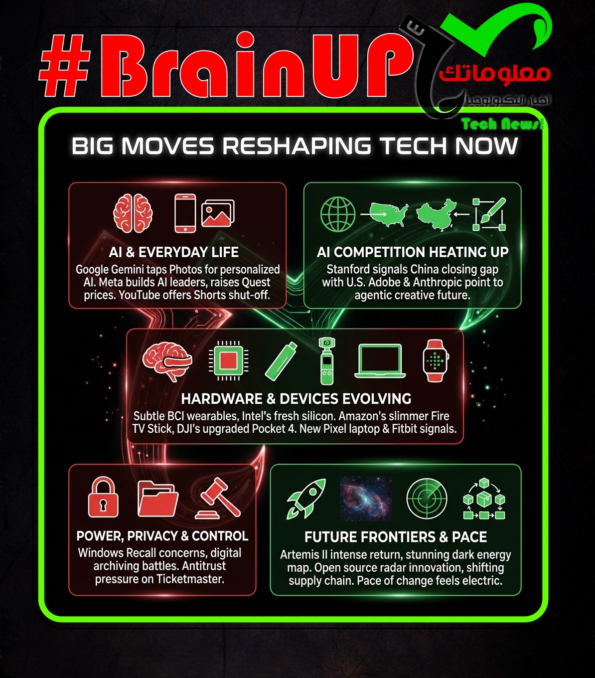 Big moves are reshaping tech right now: Google is pushing personalized AI deeper into everyday life with Gemini tapping Google Photos, Meta is building AI versions of leaders and raising Quest prices, and YouTube is finally giving users a way to shut off Shorts completely. AI competition is heating up fast as Stanford signals China has nearly closed the gap with the U.S., while Adobe and Anthropic point to a more agentic creative future. Hardware and devices are evolving too, from subtle brain computer interface wearables and Intel’s fresh laptop silicon to Amazon’s slimmer Fire TV Stick, DJI’s upgraded Pocket 4, and signals of a new Pixel laptop and Fitbit band. At the same time, power, privacy, and control are front and center, from Windows Recall concerns and digital archiving battles to antitrust pressure on Ticketmaster. Add in Artemis II’s intense return, a stunning new dark energy map, open source radar innovation, and shifting supply chain strategy, and the pace of change feels electric. …