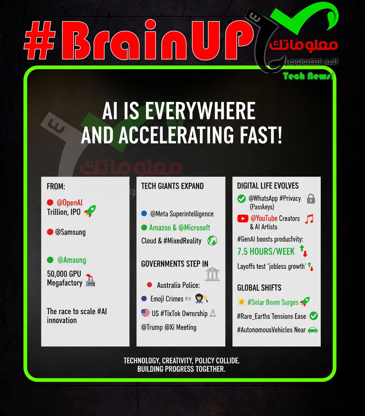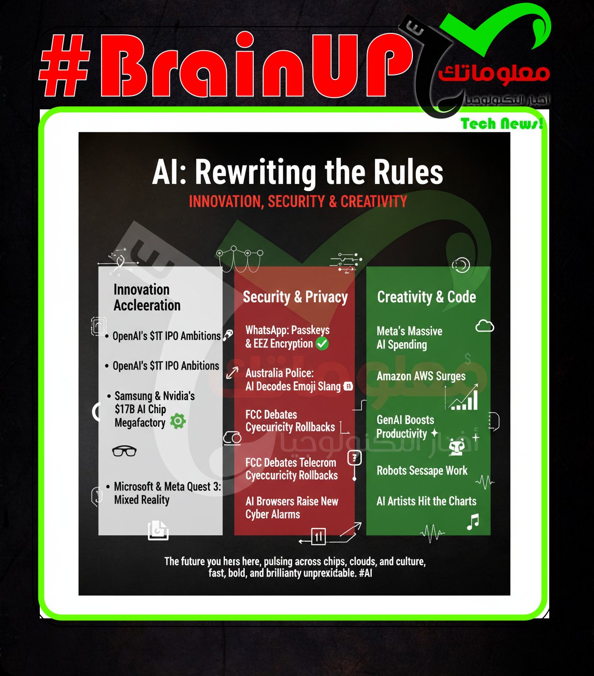 AI is rewriting the rules of innovation, security, and creativity all at once. From @OpenAI’s trillion‑dollar IPO ambitions to @Samsung’s $17B #AI chip megafactory with @Nvidia, the race for smarter, faster tech is accelerating. @Microsoft expands #Windows11 into mixed reality with @Meta Quest 3, while @WhatsApp strengthens privacy with #passkeys and end‑to‑end encryption. Governments are catching up too, with Australia’s police using #AI to decode emoji slang and the FCC debating telecom cybersecurity rollbacks. Meanwhile, @Meta’s massive #AI spending shakes markets, @Amazon’s #AWS surges, and #AIbrowsers raise new cybersecurity alarms. Yet amid all this, #genAI boosts productivity, #robots reshape work, and #AIartists hit the charts, proving creativity and code now share the same stage. The future is here, pulsing across chips, clouds, and culture—fast, bold, and brilliantly unpredictable.